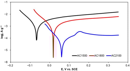 An increase in heat-treatment temperature of the tested carbon materials resulted in a clear increase not only in OCP but also in Ecorr. Given that Ecorr is attributed to the susceptibility of a material to corrosion phenomena, it can be concluded that AC1500 corrodes more easily than AC2100. The Rp value shows material resistance to corrosion under specified conditions. AC2100 has a significantly higher (more than 20 times) Rp value in comparison with AC1500, which implies very high stability of the material. Moreover, this is reflected by the very low corrosion current density observed for AC2100; the lower the corrosion current density, the lower the corrosion rate observed for the specified material. Differences in corrosion resistance between AC1500 and AC1800 are clear but not so evident as in the comparison of these materials with AC2100. Increasing the heat-treatment temperature above 1500 °C resulted in a clear increase in corrosion resistance and a significant decrease in corrosion rate.