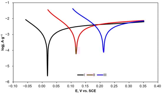 The corrosion parameters, i.e., OCP, corrosion potential (Ecorr), corrosion current density (jcorr), polarization resistance (Rp), and anodic and cathodic Tafel slopes (ba and bc), determined from the polarization curves are listed in Table 3.