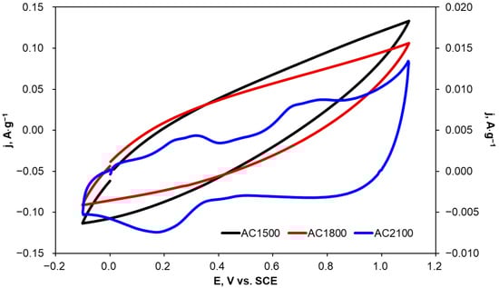 Cyclic voltammograms recorded in 0.1 mol·L−1 KCl for AC1500 (left axis), AC1800 (left axis), and AC2100 (right axis) carbon materials; v = 10 mV·s−1.