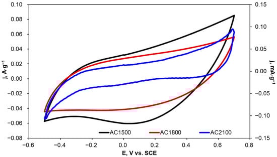 In the case of porous carbon materials, cyclic voltammograms recorded at different scan rates are expected to show a rectangular shape. The rectangular shape is characteristic of the pseudo-capacitive behavior of an electrode. Carbon materials heat-treated at 1500 and 1800 °C (AC1500 and AC1800) are characterized by cyclic voltammograms with a near-rectangular shape (Figure 7). This fact can be ascribed to high contact resistance at the electrode/electrolyte interface due to the existence of oxygen-containing functional groups [50]. However, a further increase in heat-treatment temperature to 2100 °C resulted in distorted voltammograms, which can be explained by the modification of the AC2100 surface by disappearing oxygen-containing functional groups and the formation of a more crystalline structure.