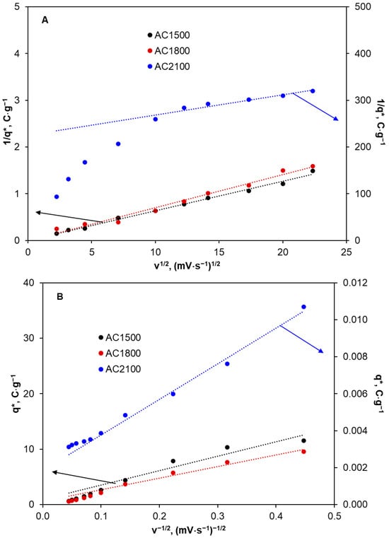 Dependences 1/q* vs. v1/2 (A) and q* vs. v−1/2 (B) determined for the activated carbons in KCl solution. AC1500 and AC1800—left axis, AC2100—right axis.