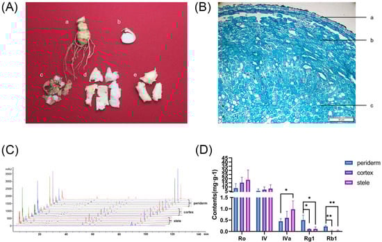 HPLC chromatograms and saponin contents in three rhizome tissues of P. japonicus. (A) Photograph of different tissues of P. japonicus rhizome: (a) rhizome, (b) cross section of rhizome, (c) periderm, (d) cortex, and (e) stele. (B) Cross-sectional microscopic structure of the P. japonicus rhizome: (a) periderm, (b) cortex, and (c) stele. (C) HPLC chromatogram profiles. (D) Contents of the five saponins in periderm, cortex, and stele. * p < 0.05, ** p < 0.01.