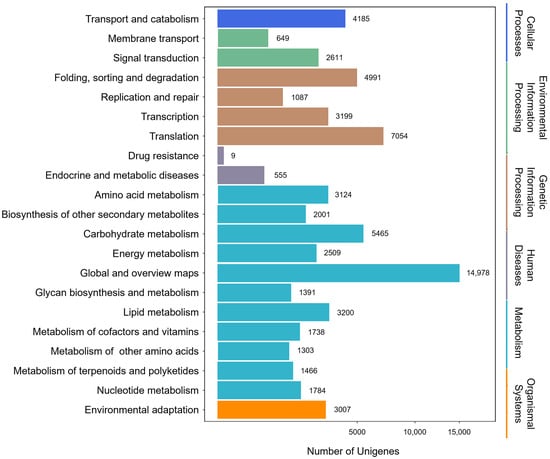 A total of 66,246 sequences were assigned to 21 KEGG pathways (Figure 2). The metabolism pathway had the highest representation of sequences, followed by genetic information processing, cellular process, environmental information processing, organismal system, and human diseases. Specifically, 38,959 sequences were categorized into the metabolic pathways, e.g., global and overview maps (14,978), carbohydrate metabolism (5465), lipid metabolism (3200), and amino acid metabolism (3124). Moreover, 1466 sequences were assigned to terpenoid and polyketide metabolism. These annotations furnished valuable insights into investigating the specific functions and terpenoid biosynthesis in P. japonicus.