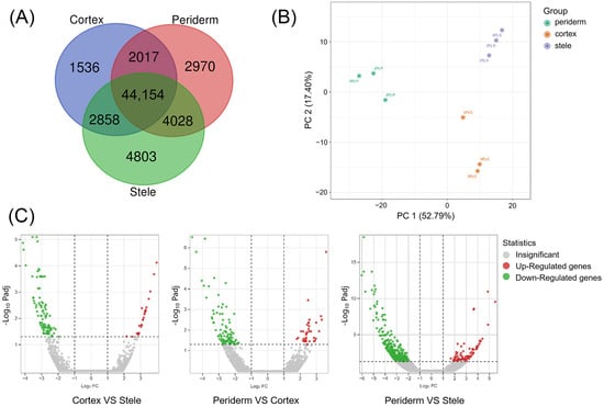 In order to better understand the gene expression in the three tissues of P. japonicus and their relationships with biological processes, we compared the DEGs among different tissues and analyzed the relationships between DEGs in each tissue. Among 62,366 expressed unigenes, 55,845 unigenes were expressed in the stele, 53,169 in the periderm, and 50,560 in the cortex. A lot of unigenes were identified in more than one tissue. There were 9309 unigenes that were solely expressed in one of the three tissues, 4803 of which were solely expressed in the stele, followed by 2970 in the periderm and 1536 in the cortex. A total of 44,154 (70.8%) unigenes were shared by the three tissues (Figure 3A).