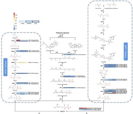 Expression of genes involved in the MVA and MEP pathways for saponin biosynthesis in P. japonicus.