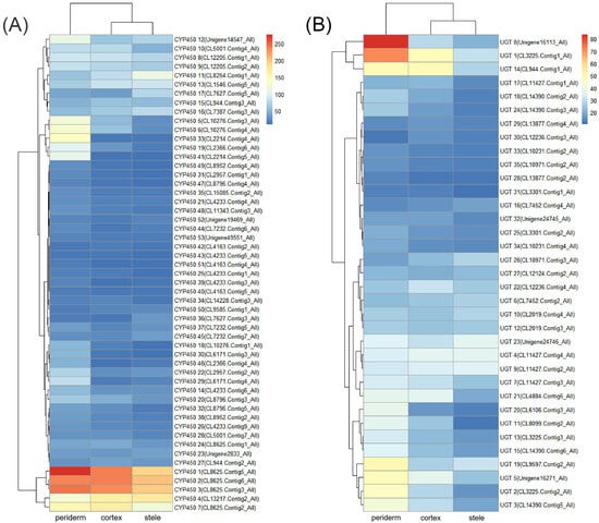 In triterpenoid saponin biosynthesis, the processes of CYPs and UGTs catalyzing the decoration of skeletons are regarded as the rate-limiting steps [14]. In our samples, the expressions of 53 CYP transcripts were significantly different (FPKM ≥ 10) among three tissues, with 37 (69.8%), 7 (13.2%), and 9 (17.0%) transcripts exhibiting maximum expression in the periderm, cortex, and stele, respectively (Figure 5A and Table S4). Additionally, the expressions of 35 UGT transcripts were significantly different, with 21 (60.0%) showing maximum expression in the periderm, 8 (22.9%) in the cortex, and 6 (17.1%) in the stele (Figure 5B and Table S5). These findings indicate the intricate regulation of CYP and UGT gene expression in a tissue-specific manner, potentially affecting the variance in saponin contents across different tissues. The differential expression of CYPs and UGTs suggested that the precursor substances of saponin biosynthesis may undergo further reactions and processing predominantly in the periderm, and the end products might ultimately accumulate in the stele.