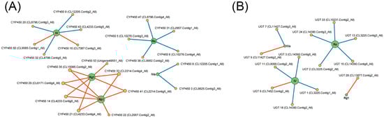 Network diagram of Pearson correlation between gene expression patterns and saponin contents in P. japonicus (|R| > 0.80 and p < 0.05). Lines colored in red and blue represent positive and negative correlations, respectively. (A) CYP gene expression patterns vs. saponin contents. (B) UGT gene expression patterns vs. saponin contents.