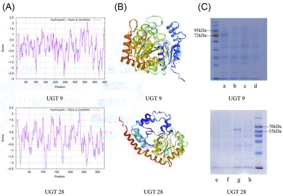 Protein structure prediction and size verification of two recombinant UGT proteins. (A) Hydrophilicity analysis of UGT 9 and UGT 28. (B) Three-dimensional structure analysis of UGT 9 and UGT 28. (C) The SDS-PAGE analysis of the recombinant UGT 9 and UGT 28: (a) 0.5 mM IPTG-induced pET14-UGT 9 expression; (b) control group without induction of pET14-UGT 9 expression; (c) 0.5 mM IPTG-induced pET14-EV expression; (d) control group without induction of pET14-EV expression; (e) same as (c); (f) same as (d); (g), 0.5 mM IPTG-induced pET14-UGT 28 expression; (h), control group without induction of pET14-UGT 28 expression.