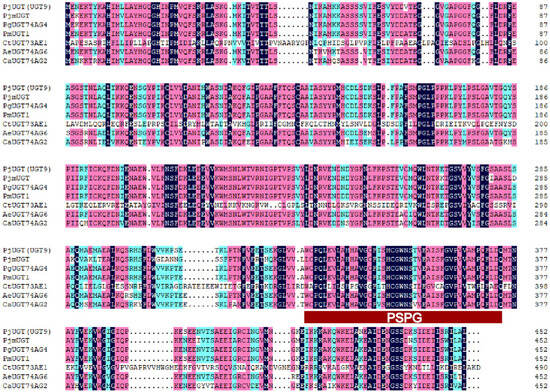 Alignment of deduced amino acid sequences of PjUGT (UGT9) with other plant UGTs: Panax japonicus (PjmUGT, WME00799), Panax ginseng (PgUGT74AG4, MH673767), Panax major (PmUGT1, ON003974), Carthamus tinctorius (CtUGT73AE1, AJT58578), Arnebia euchroma (AeUGT74AG6, OK094513), and Centella asiatica (CaUGT74AG2, MF471461). The UGTs’ signature PSPG motifs are marked with a red rectangle. Fully conserved residues are highlighted in dark blue, strongly conserved (score = 0.75) ones in pink, and weakly conserved (score = 0.5) ones in light blue.