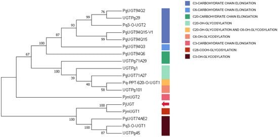Phylogenetic analysis of Panax japonicus UGT. The ClustalW algorithm was utilized for sequence alignment, and the tree was constructed using the neighbor-joining method. The red arrow indicates PjUGT (UGT9). The accession numbers used are given in Table S2.
