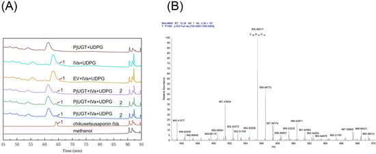 HPLC and LC/MS analysis of the glycosylation activity of recombinant PjUGT protein. (A) Identification of transformation product by HPLC analysis: (1) peak of chikusetsusaponin Iva and (2) peak of new product. (B) Identification of transformation product by LC/MS analysis.
