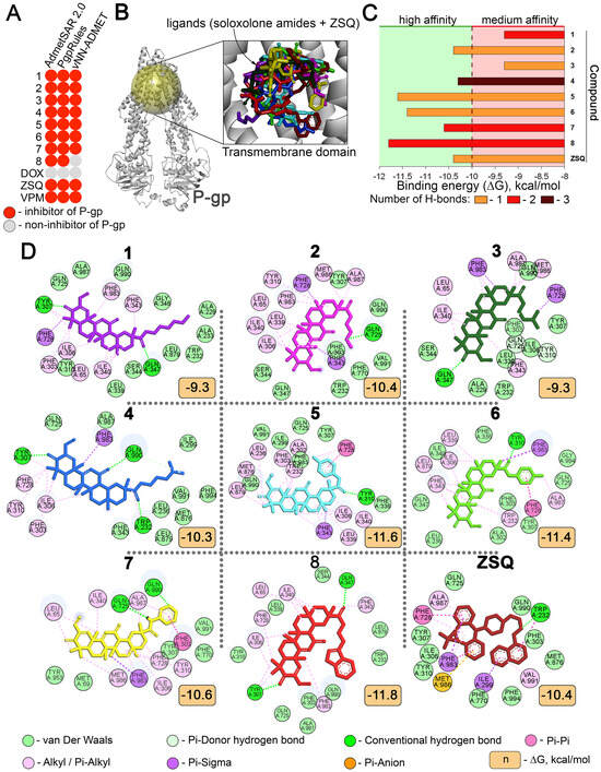First, to independently assess the P-gp targeting potential of soloxolone amides 1–8, their anti-P-gp properties were predicted using three independent absorption, distribution, metabolism, excretion, and toxicity (ADMET) web servers, AdmetSAR2.0 [30], PgpRules [31], and vNN-ADMET [32]. As shown in Figure 2A, all prediction tools used showed a high potential of 1–8 to suppress P-gp activity.