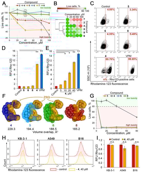 Effect of soloxolone amides on Rhodamine-123 (Rho123) accumulation by KB-8-5 cells. (A) Cytotoxicity of 2 and 4–8 (20–100 μM) in KB-8-5 cells evaluated by MTT assay after 30 min of incubation. Non-toxic compounds and their concentration are highlighted with a rounded rectangle. (B) Heat map showing sensitivity of KB-8-5 cells to 2 and 4–8 (20–100 μM) evaluated by MTT test after 30 min of incubation. Non-toxic compounds and their concentrations are highlighted with a rounded rectangle. (C) Flow cytometric analysis of Rho123 fluorescence of KB-8-5 cells after incubation with Rho123, VPM (50 μM), 4–6, and 8 (40 μM) for 30 min. Control, untreated cells stained with Rho123 only. (D) Relative fluorescence level of KB-8-5 cells incubated with Rho123, VPM (50 μM), 4–6, and 8 (40 μM) for 30 min (n = 3). Control, untreated cells stained with Rho123. (E) Dose-dependent effect of 4 (5–40 μM) on Rho123 uptake by KB-8-5 cells (n = 3). (F) Three-dimensional representation of 4–6 and 8 surfaces overlapping with ZSQ (yellow) in transmembrane domain of P-gp. Conformations were predicted using AutoDock Vina. Visualization and calculation of volume overlap were performed using BIOVIA Discovery Studio. (G) Cytotoxicity of 4–6 and 8 (10–80 μM) in KB-8-5 cells evaluated by MTT assay after 72 h incubation. (H) Flow cytometry assessment of Rho123 uptake by KB-3-1, A549, and B16 cells after incubation with Rho123 and 4 (40 μM) for 30 min. Control, untreated cells stained with Rho123 only. (I) Relative fluorescence level of KB-3-1, A549, and B16 cells incubated with Rho123 and 4 (40 μM) for 30 min. Control, untreated cells stained with Rho123. * p < 0.05; ** p < 0.01, n.s.—not significant.