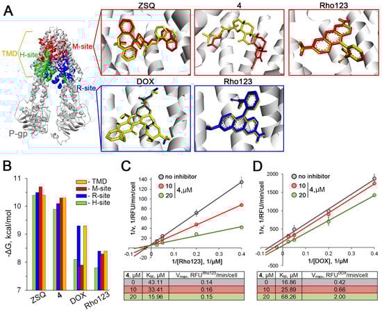 To verify these data, an independent blind docking covering the entire transmembrane domain of P-gp was performed. A comparison of the ligand conformations obtained by blind docking (Figure 5A, yellow-colored molecules) and site-specific docking (Figure 5A, red- or blue-colored molecules) revealed their high overlap and close free Gibbs energies, confirming the preferential binding of DOX to the R-site, the non-selective binding of Rho123 to the R- and M-sites, and the targeting of ZSQ and 4 to the M-site discussed above.