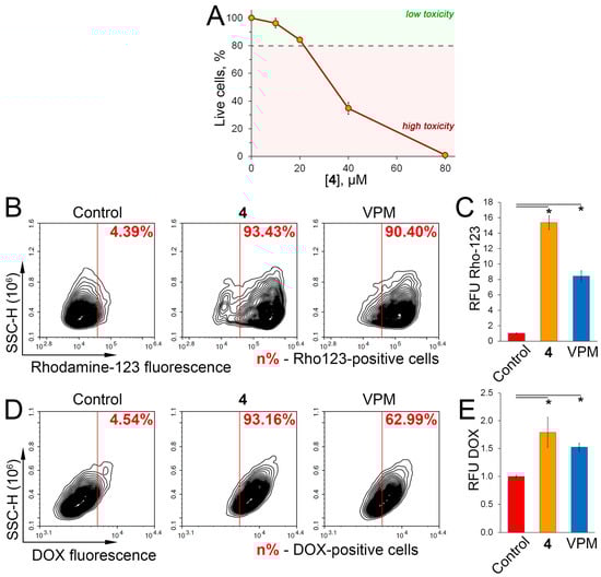 Finally, to double check the inhibitory effect of 4 on P-gp transport activity, compound-4-induced changes in Rho123 and DOX efflux were independently evaluated in murine lymphosarcoma RLS40 cells overexpressing P-gp [48]. First, a non-toxic concentration of 4 at 20 μM was detected in RLS40 cells by a WST assay (Figure 6A) and used for further experiments. The Rho123 assay showed a significant increase in Rho123high cell population and intracellular Rho123 accumulation in compound-4-treated RLS40 cells by 21.3-fold and 15.6-fold, respectively, compared to the untreated control (Figure 6B,C). Consistent with these data, 4 effectively inhibited DOX efflux from RLS40 cells, as evidenced by an increase in the number of DOXhigh cells and intracellular DOX accumulation of 93.2% and 75%, respectively, compared to the control (Figure 6D,E). Notably, the efficacy of 4 was comparable to or slightly higher than that of VPM in the DOX (Figure 6E) and Rho123 (Figure 6C) assays performed. Intriguingly, the anti-P-gp activity of 4 in RLS40 cells (Figure 6) was more pronounced compared to that in KB-8-5 cells (Figure 3C–E and Figure 4A,B), which may be explained by the different levels of P-gp expression in these cells and possibly by the different affinity of 4 for human and murine P-gp, which requires further detailed studies. In any case, the demonstrated inhibitory activity of 4 against P-gp-mediated efflux in two independent cell models suggests its high therapeutic potential in MDR tumors.