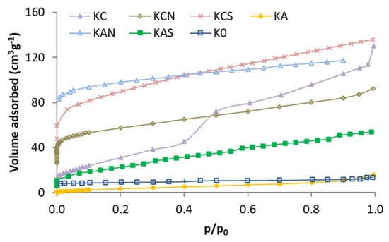 The N2 adsorption isotherms of the activated kenaf carbons are shown in Figure 1. As shown in isotherms, carbonized kenaf has a poorly developed porosity, whereas all the activated carbons show a greater porosity (except KA). Isotherms with higher capacity are of type I (KAN, KCS, and KCN), type II (KAS), or type I + II (KC) [35]. The KC isotherm has a “step” in the middle of the isotherm that can be a significant volume of pores with a narrow distribution. This is not observed in the KC acid-treated carbons (KCN and KCS). Treatment with mineral acids produced a different effect on the two activated carbons. While treatment with H2SO4 showed the best result produced on carbon activated with CO2 (KCS), treatment with HNO3 is best suited for the one activated with air (KAN).