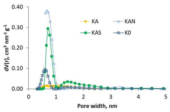 The activation treatment with CO2 (KC sample) had a limited effect on micropores: the volume increased nearly twice, but the adsorption energy (E0) and average diameter (L) were similar. However, it differed greatly with air activation (KA sample): micropores almost disappeared in KA, and the average diameter widened. This may be because the blocked pores are the narrowest, so the adsorption energy is lower as they do not have micropores, and the average width increases as the blocked pores cannot be measured.