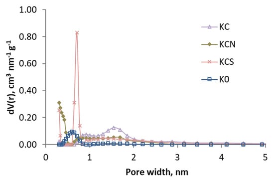 Pore size distributions (based in DFT) of the samples activated with CO2 and K0.