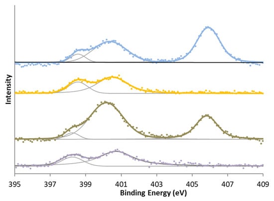 Two zones can be differentiated in the XPS spectrum of N 1s (Table 6). The first zone is around 398–401 eV and can be regarded as characteristic of pyrrolic nitrogen, pyridones, quaternary nitrogen, and other reduced forms of nitrogen. The second zone usually appears around 405 eV and is characteristic of oxidized nitrogen functionalities.