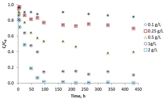 The evaluation of phenol concentration was studied using different adsorbent ratios. As expected, the higher the amount of activated carbon used, the better the pollutant removal. More than 90% of the phenol is removed with all adsorbents except the less porous ones (KA and KAS) where 80% and 60% of the phenol is removed after 300 h. On the other hand, the KC and KCN carbons stand out, where equilibrium is achieved in about 100 h, and 94 and 98% of the phenol has been adsorbed. Figure 6 shows the results for KCN activated carbon. The plots of the other adsorbents are shown in Supplementary Materials (Figures S2–S6).