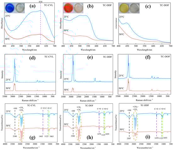 Structural analysis of three thermochromic dyes at 25 °C and 50 °C, respectively: (a–c) UV absorption spectra; (d–f) Raman spectra; (g–i) FTIR spectra.