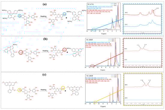 To further verify the structure of thermochromic dyes and the changes in their molecular structure before and after heating, the three dyes—TC-CVL, TC-DDF, and TC-DOF were characterized using a solid-state NMR at 25 °C and 50 °C, respectively, as shown in Figure 3. TC-CVL in Figure 3a as an example, the absorption peaks of each hydrogen atom at 25 °C were δ15.12 ppm, δ13.23 ppm, δ12.57 ppm, δ7.09 ppm, δ6.72 ppm, δ3.87 ppm, δ2.01 ppm, and δ1.31 ppm. In contrast, at an elevated temperature of 50 °C, the absorption peaks were δ15.21 ppm, δ13.27 ppm, δ12.59 ppm, δ12.30 ppm, δ7.83 ppm, δ7.11 ppm, δ6.67 ppm, δ6.38 ppm, δ5.70 ppm, δ3.94 ppm, δ3.76 ppm, δ3.27 ppm, δ1.98 ppm, δ1.31 ppm, δ1.02 ppm, and δ0.62 ppm. Based on the structural analysis of CVL and tea polyphenols, the peak at δ12.3 ppm corresponded to the phenolic hydroxyl active hydrogen of tea polyphenols. This was attributed to the phase transition of tetradecanol from solid to liquid state at 50 °C, which weakened the interaction between CVL and tea polyphenols. Consequently, the conjugated colorimetric structure was dissociated, and the hydrogen bonds between CVL and tea polyphenols broke as the temperature increased. The phenolic hydroxyl active hydrogen of tea polyphenols was influenced by the CVL conjugated structure, leading to a decrease in the extra-nuclear electron cloud density, a weakened shielding effect, an increased effective magnetic field, and a higher chemical shift. The analysis of Figure 3b,c indicated that TC-DDF and TC-DOF exhibited similar changes. This indicated that the three thermochromic dyes—TC-CVL, TC-DDF, and TC-DOF exhibited reversible thermochromic behavior. This behavior was facilitated by the disruption and subsequent reformation of hydrogen bonds between the cryptochromic dyes and tea polyphenols [25].