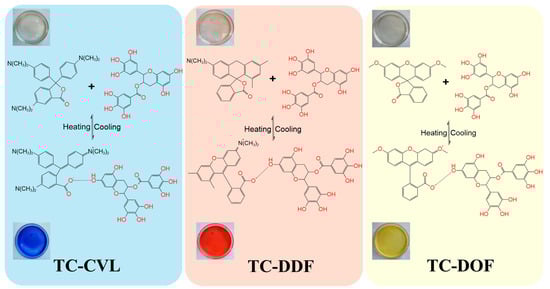 Molecular structure changes of three thermochromic dyes—TC-CVL, TC-DDF, and TC-DOF with heating and cooling.
