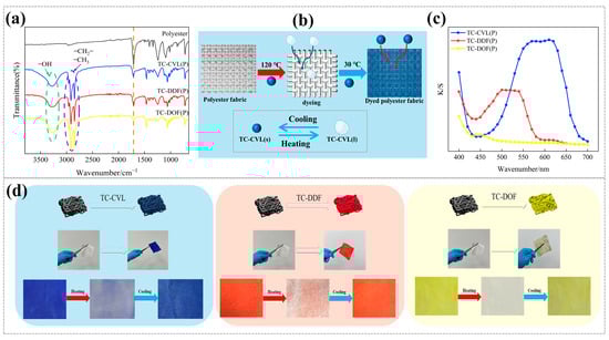 (a) FTIR spectra of both untreated and thermochromic polyester fabrics; (b) dyeing process methodology; (c) K/S values of three thermochromic polyester fabrics; (d) comparative analysis of fabrics pre- and post-dyeing, highlighting their reversible thermochromic properties under thermal cycling.