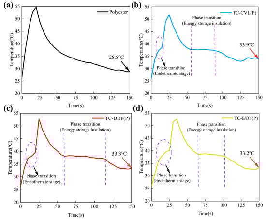 Temperature–time curve analysis for both polyester and thermochromic polyester fabrics: (a) polyester fabric; (b) TC-CVL-polyester fabric; (c) TC-DDF(P)-polyester fabric; (d) TC-DOF(P)-polyester fabric.