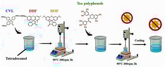 The materials listed in Table 1 were individually added to the dissolved state of tetradecane and subjected to stirring at 300 rpm for 2 h at 90 °C, ensuring the formation of a homogeneous solution. Subsequently, the tea polyphenol was uniformly incorporated into the above solution, followed by an additional 2 h of stirring at 90 °C. The mixture was then maintained at a constant temperature for 0.5 h before cooling to room temperature, resulting in the formation of biomass thermochromic dyes, as illustrated in Figure 8. These three biomass thermochromic dyes exhibited reversible thermochromic behavior, making them suitable for various applications in intelligent textiles. The synthesis process not only ensured the uniform distribution of the dye components but also enhanced the thermal stability and color-changing properties of the resulting materials.
