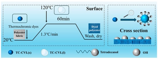 Tetradecanol was utilized as a solvent for multi-component thermochromic materials, offering excellent solid/liquid phase change properties along with being environmentally friendly, cost-effective, and readily available. Polyester fabrics were dyed by impregnation to produce three reversible thermochromic fabrics in blue, red, and yellow using TC-CVL, TC-DDF, and TC-DOF dyes, respectively (as shown in Figure 5b). Tetradecanol served as the dyeing medium, leveraging its solid/liquid phase change properties.