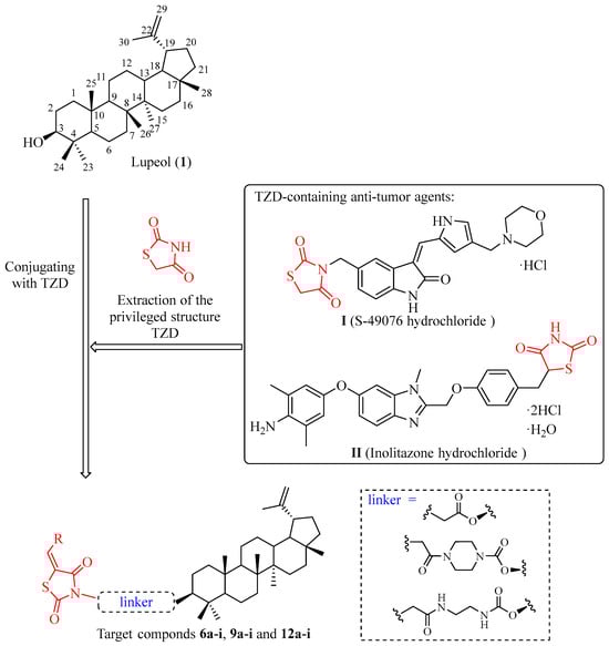 We decided to incorporate the TZD moiety into the C-3 position of lupeol with ester, piperazine–carbamate, or ethylenediamine as a linker. In this way, we designed the TZD-conjugated compounds 6a–i, 9a–i, and 12a–i to improve the potential of lupeol against different cancer cells (Figure 1). The target compounds were synthesized, and their antitumor activities against the human non-small cell lung cancer cells (A549), human breast cancer cells (MCF-7), human hepatocellular carcinomas cells (HepG2), and human hepatic cells (LO2) were evaluated. In addition, the mechanism of action of compound 12i was further investigated.