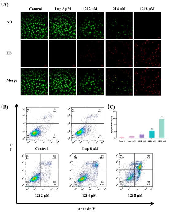 Compound 12i induces HepG2 cell apoptosis. (A) HepG2 cells were treated with 12i (2, 4, and 8 µM) or 0.1% DMSO (blank control) and then stained with AO/EB. Normal cells were stained green with AO staining solution with intact nuclei, apoptotic cells were stained red with EB staining solution. (B) Detection of apoptosis in HepG2 cells treated with various concentrations (0, 2, 4, and 8 µM) of 12i for 48 h using an Annexin V-FITC/PI double-staining assay. (C) Percentage of cell apoptosis for different concentrations of 12i (* p < 0.05, ** p < 0.01, and *** p < 0.001 compared with the blank control group). Error bars are representative of three independent experiments.