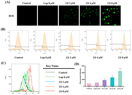 ROS are a key element in cancer therapy [34]. To evaluate whether compound 12i can affect ROS production in HepG2 cells, we used 2′,7′-dichlorofluorescein diacetate (DCFH-DA) staining to determine the ROS levels. After 48 h, morphological variations in the cells were observed using fluorescence microscopy, as shown in Figure 3A. The green fluorescence of the 12i-treated experiments was more obvious than that of the blank control, and the green fluorescence of 12i (8 μM) was the most obvious. According to the above data, compound 12i induces ROS production dose-dependently in HepG2 cells. Flow cytometry was used to detect changes in HepG2 cell ROS content, and the results are shown in Figure 3B–D. The above data indicates that compound 12i significantly increased the production of ROS, which may also be responsible for its induction of apoptosis.