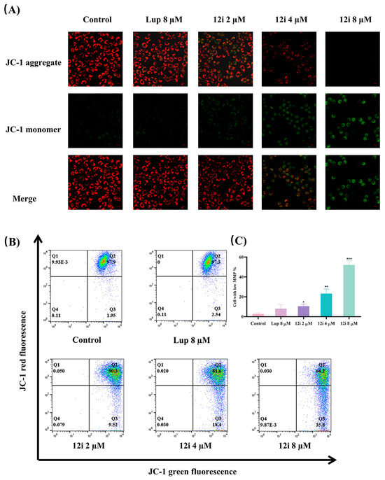 Compound 12i induces MMP in HepG2 cells. (A) HepG2 cells were treated with 12i (2, 4, and 8 µM) or 0.1% DMSO (blank control) and then stained with JC-1. (B) Determination of MMP depolarization rate in HepG2 cells. (C) Percentage of decreasing MMP for different 12i concentrations (* p < 0.05, ** p < 0.01, and *** p < 0.001 compared with the blank control group). Error bars represent three independent experiments.