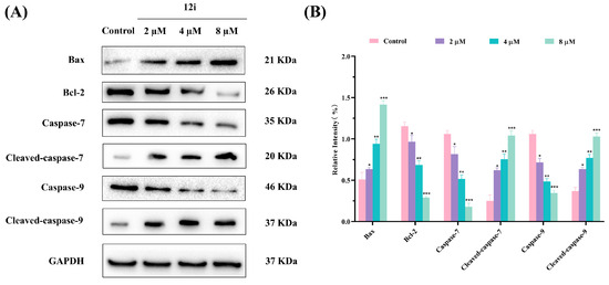 Compound 12i inhibited the mitochondrial apoptosis pathway. (A) Western blot analysis of the expression levels of Bax, Bcl-2, caspase-7, cleaved-caspase-7, caspase-9, and cleaved-caspase-9 proteins in HepG2 cells treated with 12i (2, 4, and 8 µM) and 0.1% DMSO (the blank control group). (B) Statistical analysis (* p < 0.05, ** p < 0.01, and *** p < 0.001 compared with the blank control group). Error bars represent three independent experiments.