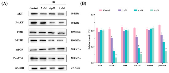 Compound 12i inhibits the PI3K/Akt/mTOR pathway. (A) Western blot analysis of the expression levels of Akt, P-Akt, PI3K, P-PI3K, mTOR, and P-mTOR in HepG2 cells after exposure to the blank control and different concentrations (2, 4, and 8 µM) of 12i for 48 h. (B) The percentage of cell apoptosis for different concentrations of 12i (*: p < 0.05, **: p < 0.01, ***: p < 0.001, compared to the blank control group) Error bars are representatives of three independent experiments.