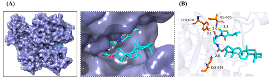 In order to investigate the binding mode of compound 12i to PI3K, molecular docking studies based on the crystal structure of PI3K (PDB: 4OYS) were performed, which revealed that 12i interacts with different reactive sites in the 4OYS variable pocket, as shown in Figure 7. Amino acid residues TRY-670 and ILE-685 form hydrogen bonds with the carbonyl groups at positions C34 and C36 in compound 12i. Perhaps this hydrogen bonding interaction pushes the bonds and substituents deep into the narrow lumen of 4OYS. Perhaps it can more efficiently promote the binding of the carbonyl group at position C31 to the active center lysine LYS-636 in the narrow grooves of 4OYS, which may affect cell growth and reproduction or the regulation of mitochondrial function. In particular, the binding of the protein–ligand complex could reach −9.07 kcal/mol, which is a good indication that compound 12i has good inhibitory activity against PI3K.