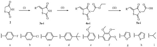 Intermediates 3a–i were obtained via the Knoevenagel condensation reaction of 2,4-thiazolidinedione (2) with different aldehydes in the presence of piperidine as the catalyst [33]. Intermediates 3a–i were alkylated with ethyl bromoacetate, yielding intermediates 4a–i. Subsequent hydrolysis under acidic conditions yielded 5a–i. This synthetic route is detailed in Scheme 1.