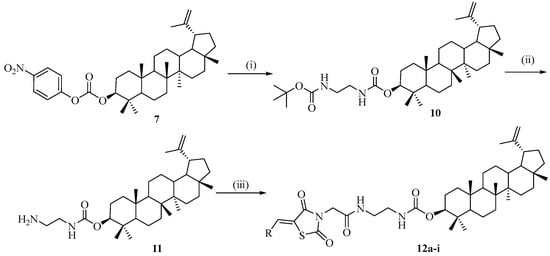 A substitution reaction occurred between compound 7 and N-Boc-ethylenediamine in the presence of Et3N, producing compound 10. Then, the N-Boc protection was removed using a trifluoroacetic acid (TFA) treatment to obtain compound 11, which then reacted with compounds 5a–i in the presence of EDCI, N-hydroxybenzotrizole (HOBT), and N, N-diisopropylethylamine (DIPEA) to obtain compounds 12a–i. The synthetic route is detailed in Scheme 4.