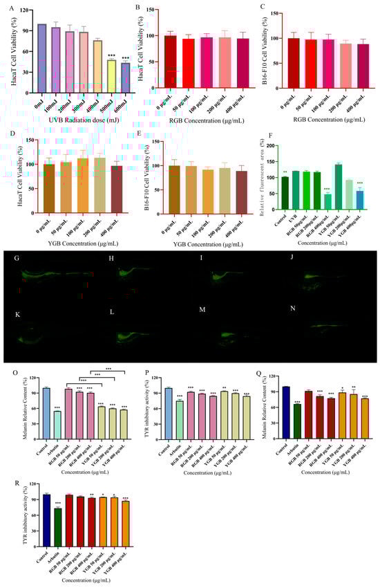 3.8. Evaluation of RGBs and YGBs for Anti-UVB Radiation and Whitening Efficacy in Zebrafish