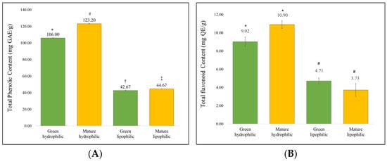 Total phenol content and Total flavonoid content. Data are presented as mean + SEM (n = 3). Panel (A) represents the gallic acid equivalent per gram of dry extract (GAE/g). Panel (B) represents the equivalent of quercetin per gram of dry extract (QE/g). Different symbols (*, #, †, ‡) indicate significant differences between groups (p < 0.05), as determined by Tukey’s post hoc test.
