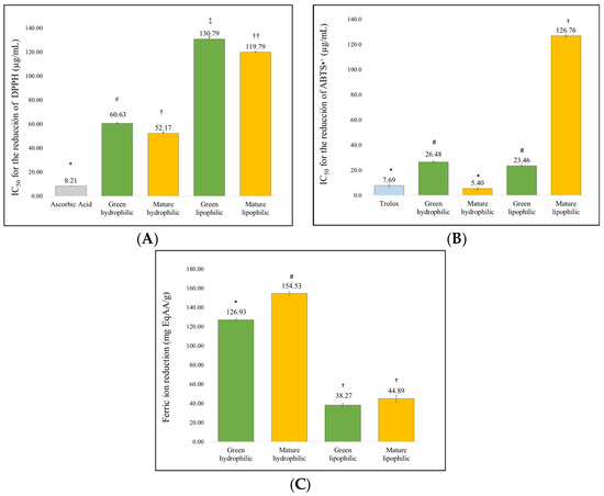 Reduction of free radicals and reduction of ferric ions by the extracts. Data are presented as mean + SEM (n = 3). Panels (A) and (B) represent the IC50 values for the radical scavenging activity of DPPH and ABTS•⁺ of different extracts. Panel (C) represents the capacity of the extracts to reduce ferric ions. Different symbols (*, #, †, ‡, ††) indicate significant differences between groups (p < 0.05), as determined by Tukey’s post hoc test.