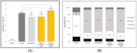 Number and differentiation of leukocytes in the exudate. Data are presented as mean + SEM (n = 6). Symbol (*) indicates a significant difference (p < 0.05) compared to the control group, while symbol (#) indicates that there is no significant difference (p > 0.05) compared to the control group, determined by Tukey’s post hoc test. (A) Number of leukocytes; (B) Leukocyte differentiation.