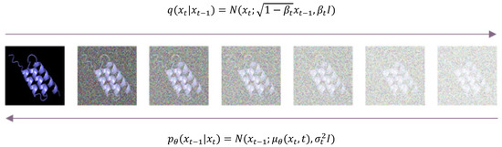 Although MSA-VAE and ProteinGan show great potential in protein design, they still face challenges in handling complex protein structure generation, especially in protein generation tasks that require the precise control of protein 3D structures. Therefore, researchers have developed the diffusion-based RfDiffusion model (denoising diffusion probabilistic models, DDPM) [21,22]. RfDiffusion combines structure prediction (RoseTTAFold) with diffusion model generation [23] to design proteins from scratch. This approach allows the creation of protein structures with complex functional properties. The model excels at a variety of protein design challenges, including the design of monomers, binders, and symmetric oligomers. It also allows for specific scaffolds and unconditional protein generation, meeting a wide range of research and practical applications in biomedicine and chemistry.