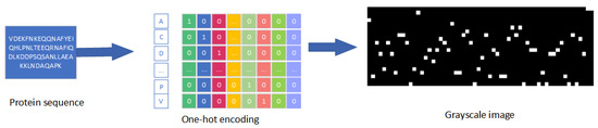 The process of encoding a protein into an image. Protein sequences are transformed into grayscale images by representing amino acids with one-hot encoded binary vectors, enabling their use in image-based analysis and machine learning models.