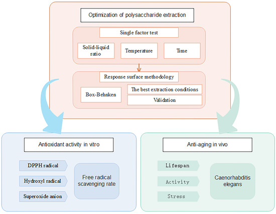In this study, AAPs were obtained using hot-water extraction, and the extraction parameters were optimized using the response surface methodology (RSM), a technology that can be used to scale up AAPs extraction in an industrial setting. The antioxidant activity of the AAPs was determined based on its in vitro scavenging ability for DPPH radicals, hydroxyl radicals, and superoxide anions. The anti-aging effect of the crude AAPs on the lifespan, swallowing frequency, locomotion ability, and stress resistance of C. elegans was studied. A flow chart is shown in Figure 1. Our findings provide theoretical support for the further development of AAPs as a functional food owing to their anti-aging and antioxidant effects.