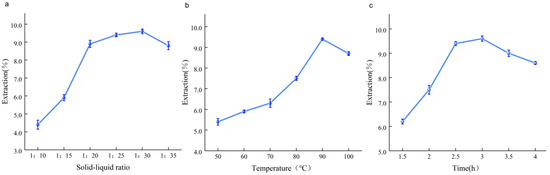 (a–c) Single-factor test for the extraction of A. aegerita polysaccharides.