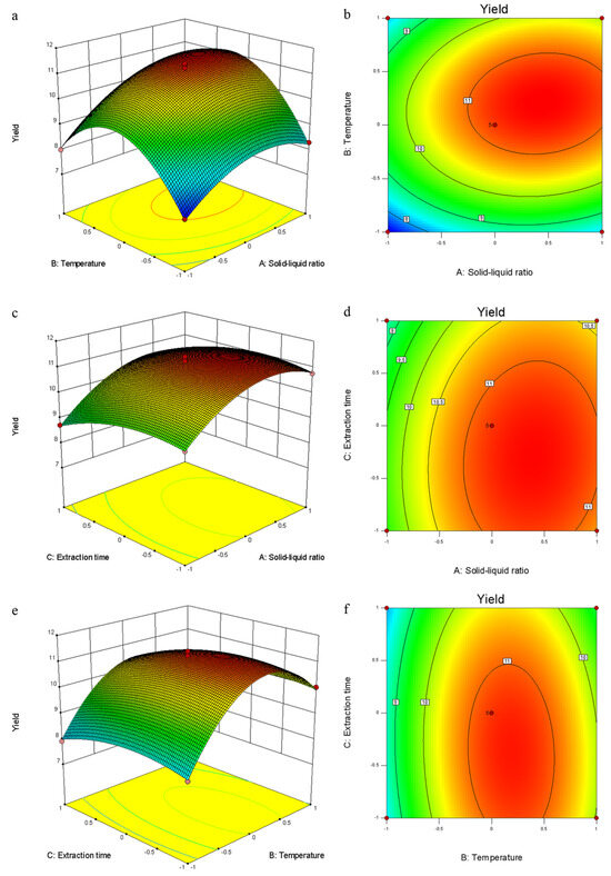 (a–f) Response surface methodology used to determine the interaction effects of various factors on the extraction yield of AAPs. (A–C) Response surface plots of solid-to-liquid ratio (X1, g/mL), extraction temperature (X2, °C), and extraction time (X3, h) on the extraction yield of AAPs.