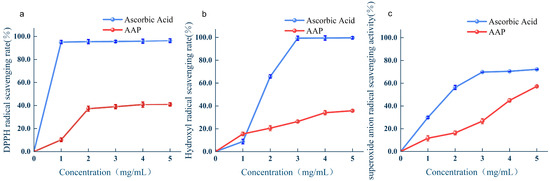 The superoxide anion radical scavenging ability of the AAPs was positively correlated with AAPs concentration (Figure 4c). At a concentration of 4 mg/mL, the superoxide anion radical scavenging rate of the AAPs was 44.90% ± 1.57%.